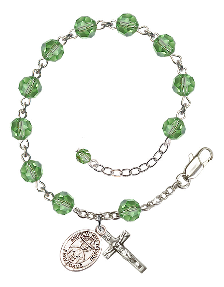 Sterling Silver 6mm Austrian Crystal St. Andrew Kim Taegon Rosary Bracelet in Peridot | Engravable