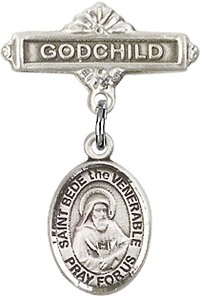 Sterling Silver Baby Badge with St. Bede the Venerable Charm and Godchild Badge Pin