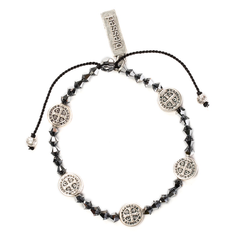 Stellar Blessings Iridescent In the radiant light of the sun and the glow of the moon, an iridescent reflection is formed on the ocean’s surface, creating a path into the horizon. Wear this bracelet as a reminder to allow this path to guide your gaze far beyond the horizon, giving you a faith-filled glimpse of the vastness of God’s love. Light Chrome Swarovski beads, five 1 cm silver dipped Benedictine medals, silver dipped “blessed” tag. This bracelet comes on cording with a sliding slipknot for an easy fit. 9" when fully opened. Stellar Blessings Iridescent comes in a box with an inspirational card.