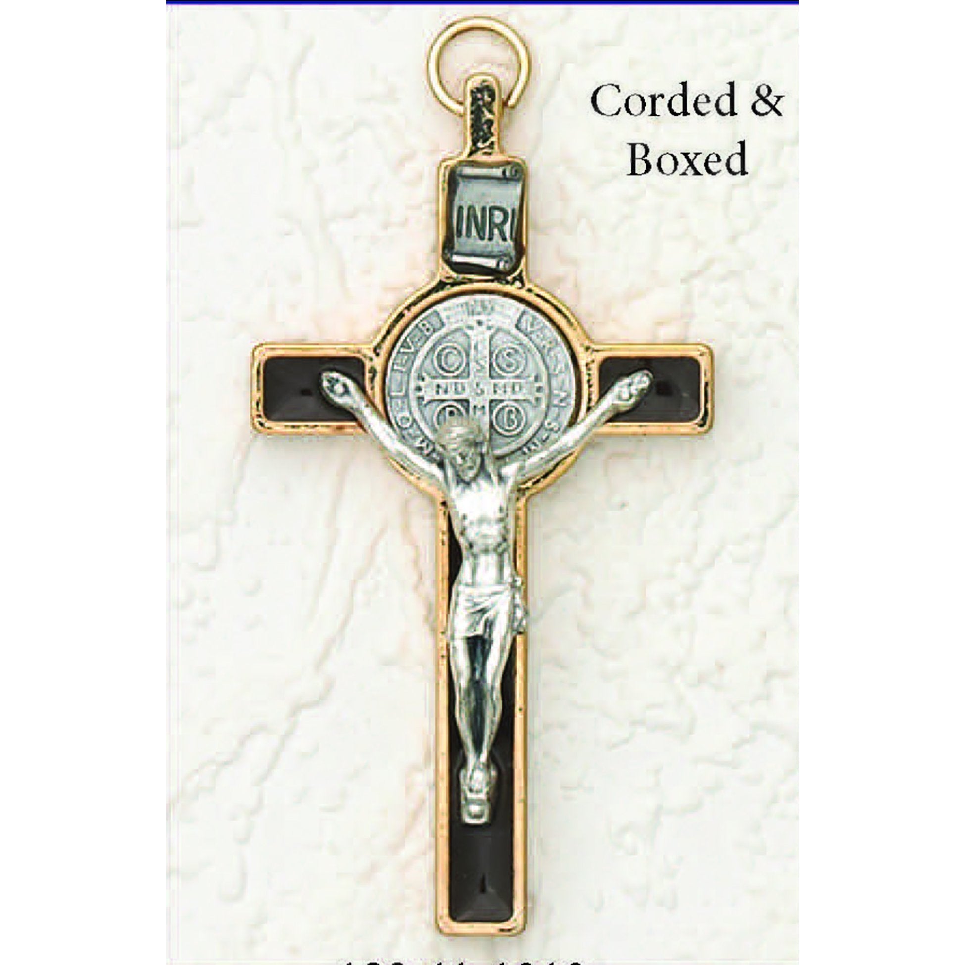 3 inch St Benedict Crucifix: Brown / Gold with Silver Corpus is a beautiful reminder of Christ's sacrifice and the protective power of St. Benedict. Measuring just 3 inches, this exquisitely crafted crucifix features a stunning silver corpus on a rich brown and gold background, making it a striking addition to any home or prayer space. Each piece is thoughtfully boxed with an explanation of the St. Benedict Medal, enriching your understanding of this powerful devotion.