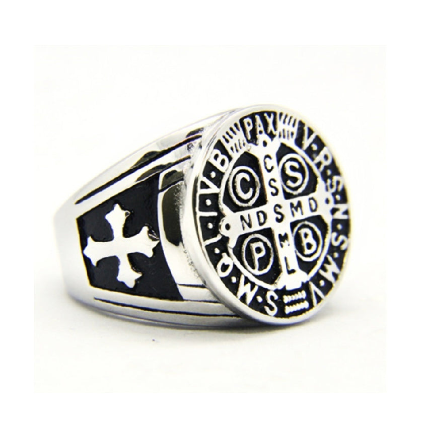 This unique silver and black St. Benedict Medal Ring by Apostle Gear features a striking vintage design and is available in various sizes. It's made to last with solid 316L Stainless Steel, and it comes in an attractive Apostle Gear gift box. The ring is lead and nickel free, and it weighs 22 grams.
