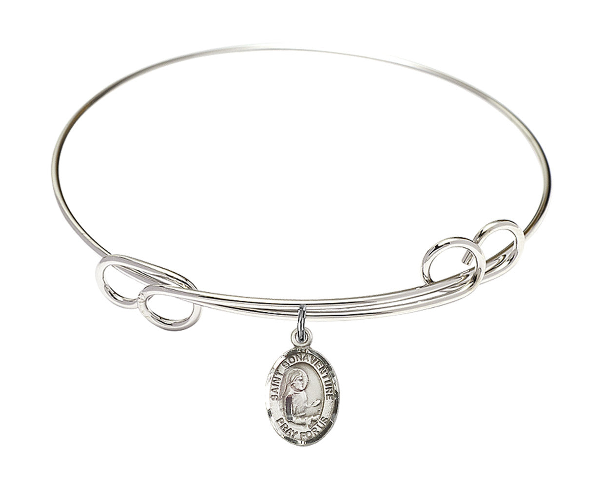 Our 7 1/2 inch Round Double Loop Rhodium Bangle Bracelet with a Sterling Silver St. Bonaventure charm. is proudly manufactured in the USA.