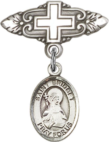 Sterling Silver Baby Badge with St. Bridget of Sweden Charm and Badge Pin With Cross