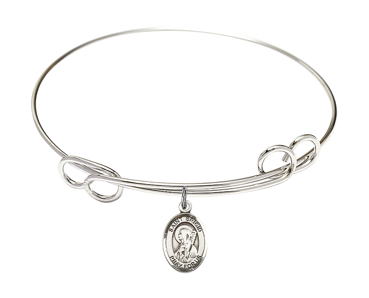 Our 7 1/2 inch Round Double Loop Rhodium Bangle Bracelet with a Sterling Silver St. Brigid of Ireland charm. is proudly manufactured in the USA.