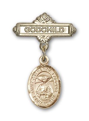 14kt Gold Filled Baby Badge with St. Catherine Laboure Charm and Godchild Badge Pin