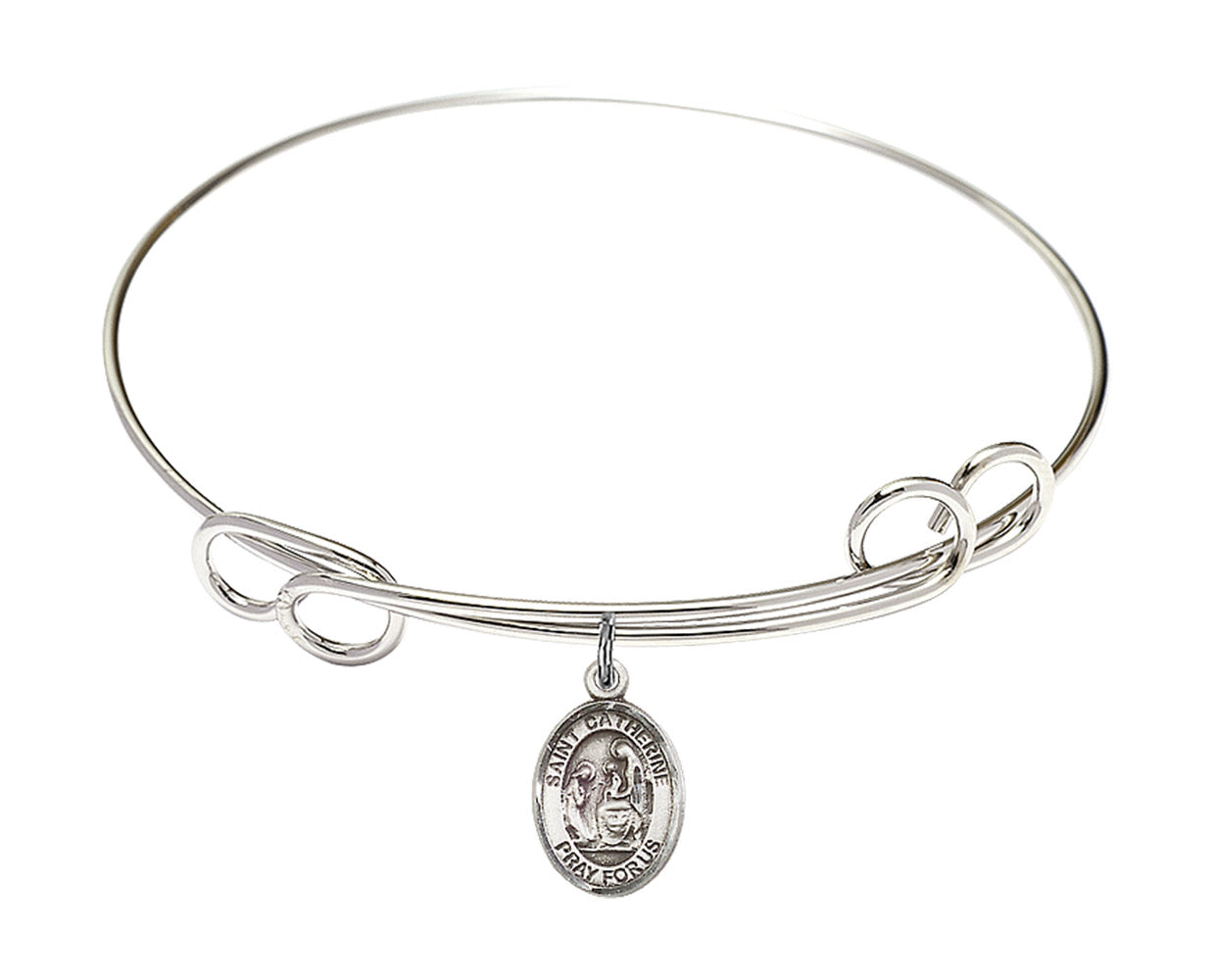 7.5-inch Round Double Loop Rhodium Bangle Bracelet | Sterling Silver St. Catherine of Siena Charm | Engravable