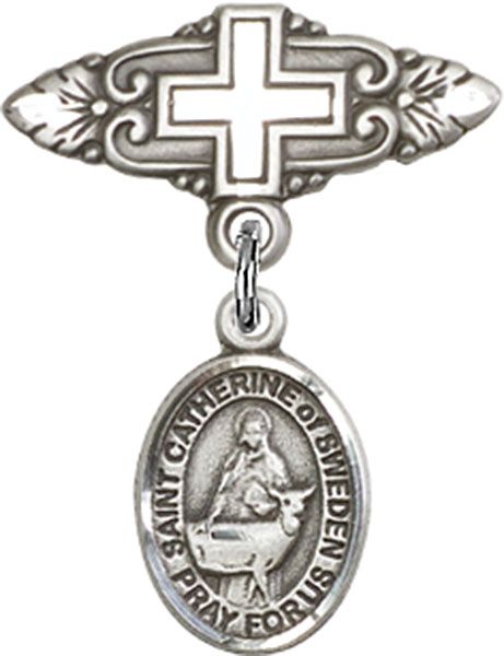 Sterling Silver Baby Badge with St. Catherine of Sweden Charm and Badge Pin With Cross