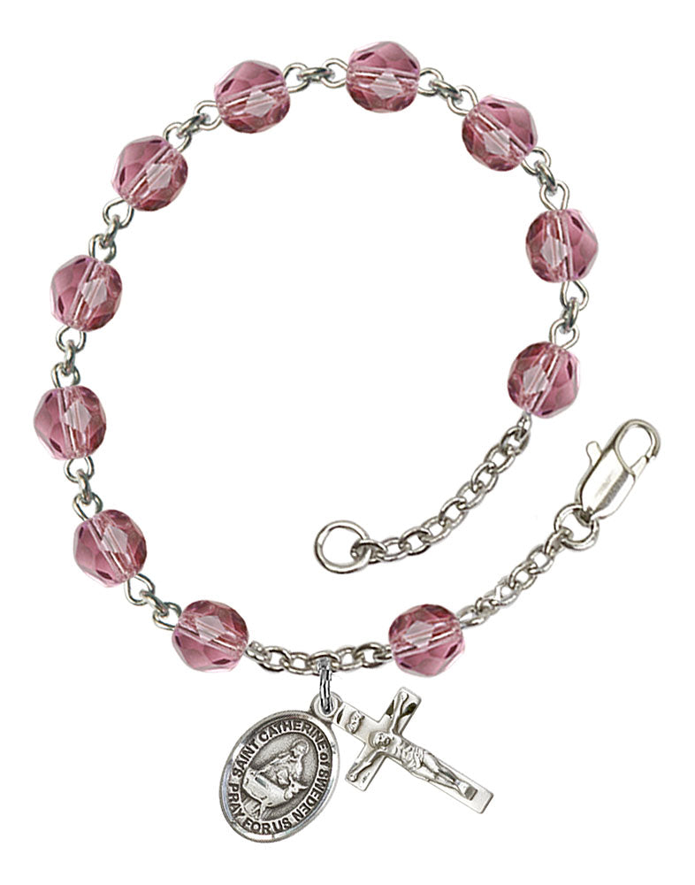 Our Saint Catherine of Sweden Rosary Bracelet features 6mm-bead Amethyst Fire Polished beads. The Crucifix measures 5/8 x 1/4 inches. The charm is a St. Catherine of Sweden medal.