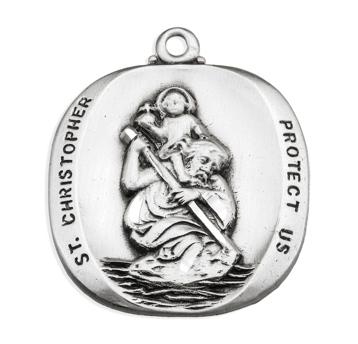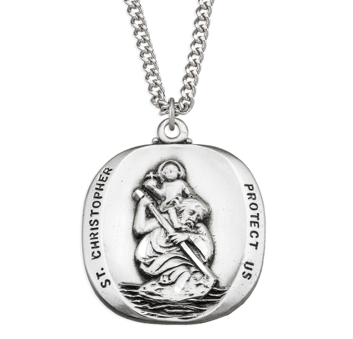 1-5/16-inch Sterling Silver St. Christopher Medal, made in the USA. The Rounded Edge Square shaped Medal is adorned with St. Christopher carrying the Infant Jesus.