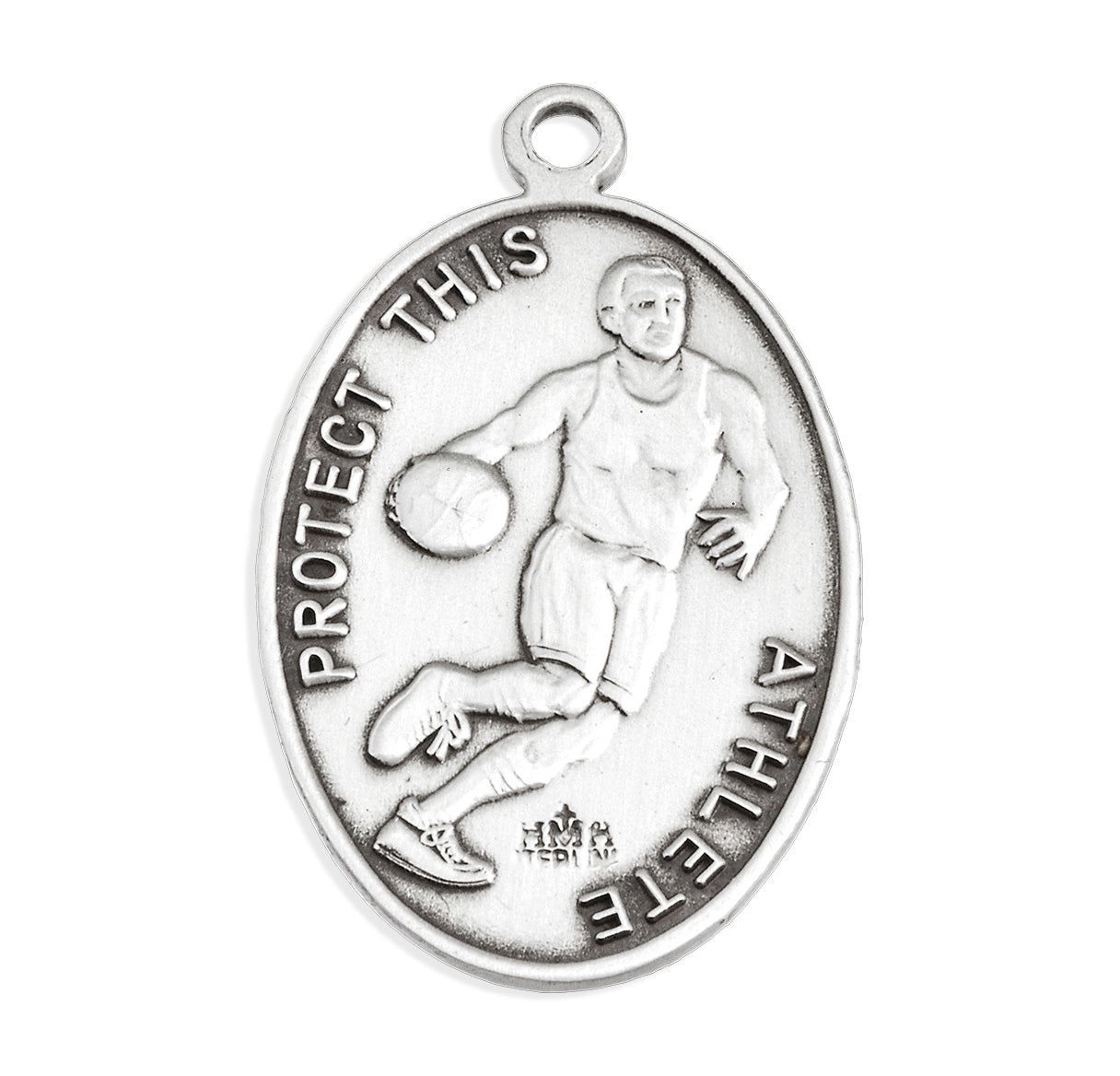 1-1/16-inch Sterling Silver St. Christopher Basketball Medal, made in the USA. The Oval Medal is adorned with St. Christopher carrying the Infant Jesus. The reverse side of the Medal Portrays a Male Basketball Player.