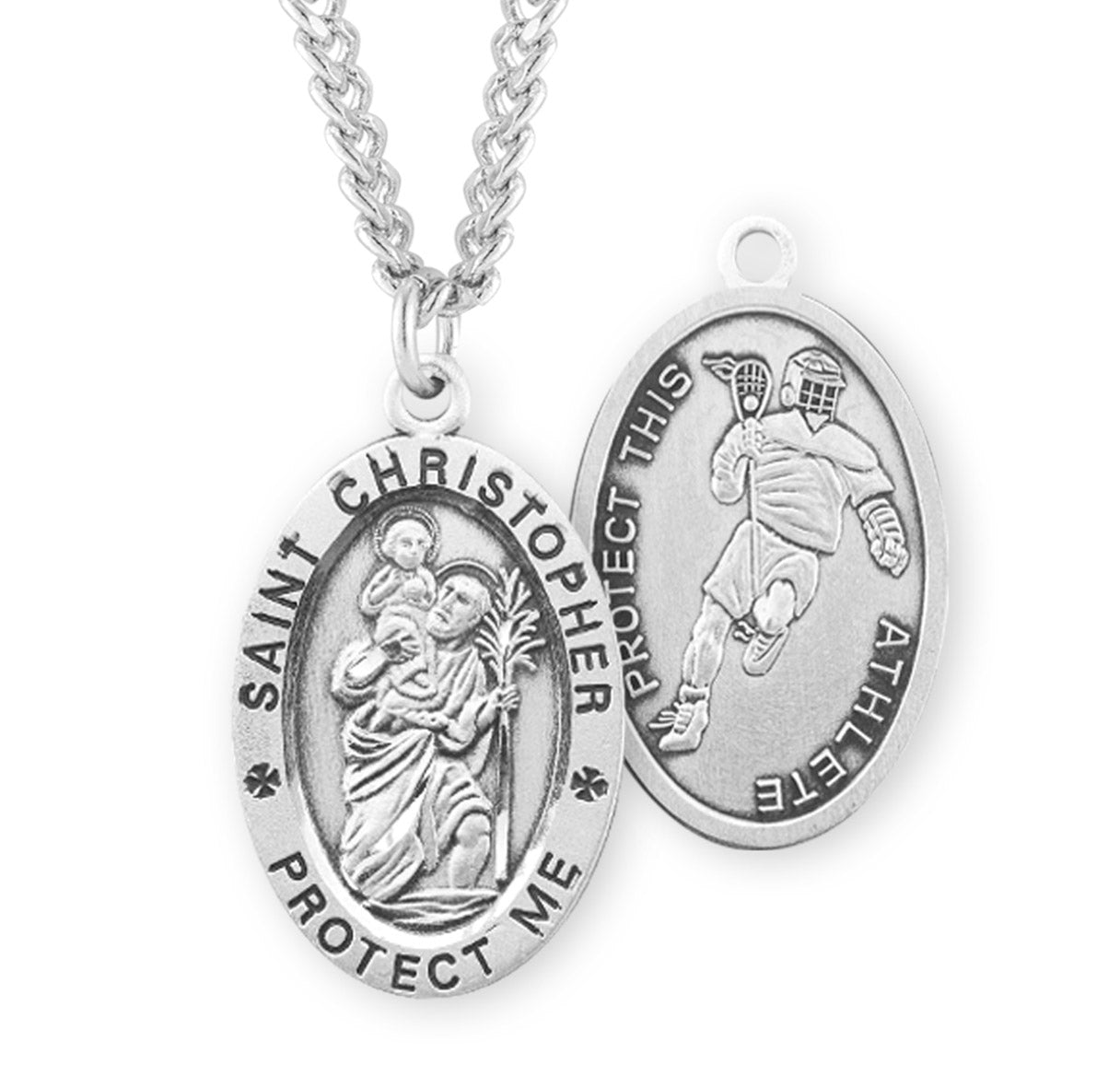 1-1/16-inch Sterling Silver St. Christopher Lacrosse Medal, made in the USA. The Oval Medal is adorned with St. Christopher carrying the Infant Jesus. The reverse side of the Medal Portrays a Male Lacrosse Player.