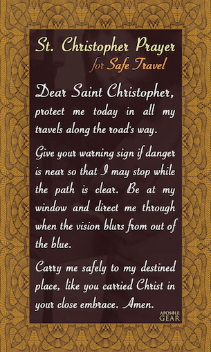 Our St. Christopher Safe Travel Prayer Cards, made exclusively by Apostle Gear, feature a beautiful centuries-old depiction of the devotion in sacred art.