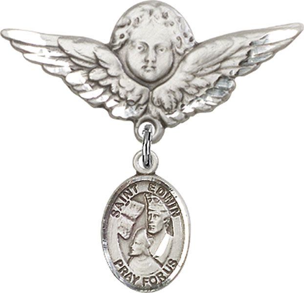 Sterling Silver Baby Badge with St. Edwin Charm and Large Angel w/Wings Badge Pin