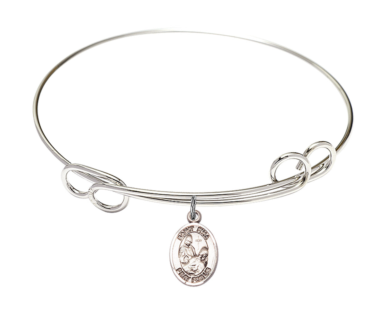 Our 7 1/2 inch Round Double Loop Rhodium Bangle Bracelet with a Sterling Silver St. Fina charm. is proudly manufactured in the USA.