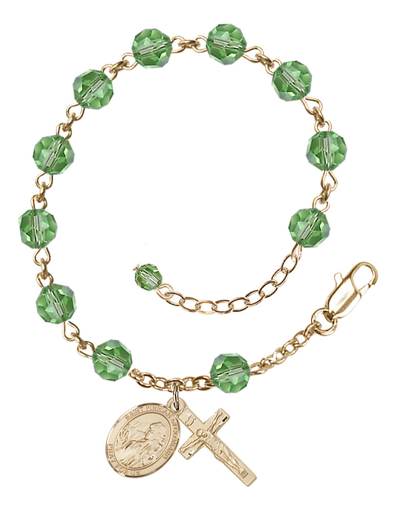 Our Adjustable 14 Karat Gold 6mm-bead Austrian Crystal Saint Finnian of Clonard Rosary Bracelet in Peridot is handmade in the USA.