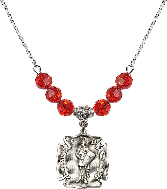 Necklace with 4mm Ruby Crystal Beads & Sterling St. Florian Medal | Engravable