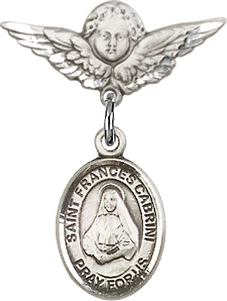 Sterling Silver Baby Badge with St. Frances Cabrini Charm and Small Angel w/Wings Badge Pin