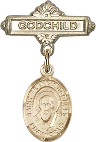 14kt Gold St. Francis de Sales charm measures 1/2 x 1/4 inches 14kt Gold Godchild Badge Pin measures 3/4 x 3/8 inches Presented in a deluxe gift box