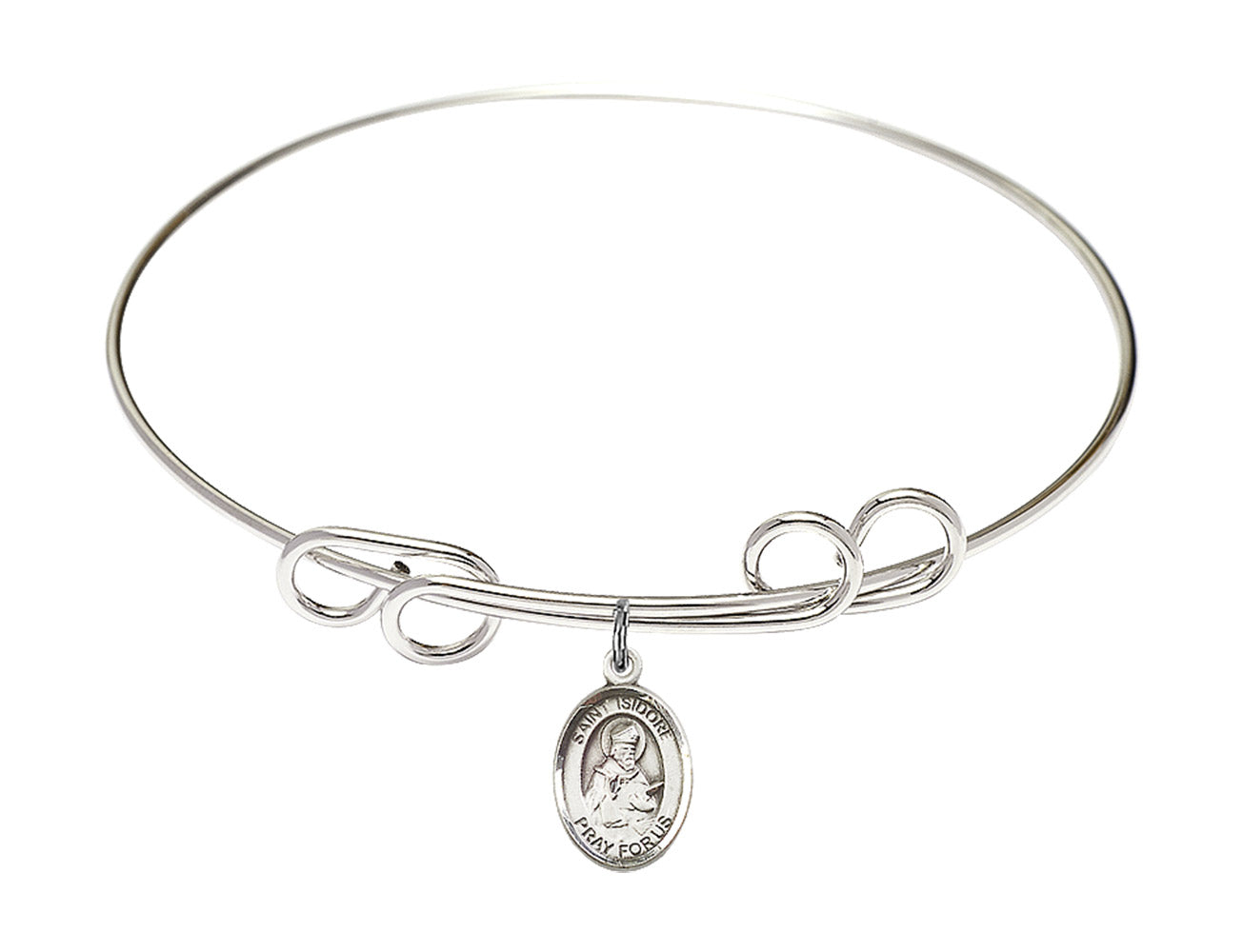 8-inch Round Double Loop Rhodium Bangle Bracelet | Sterling Silver St. Isidore of Seville Charm | Engravable