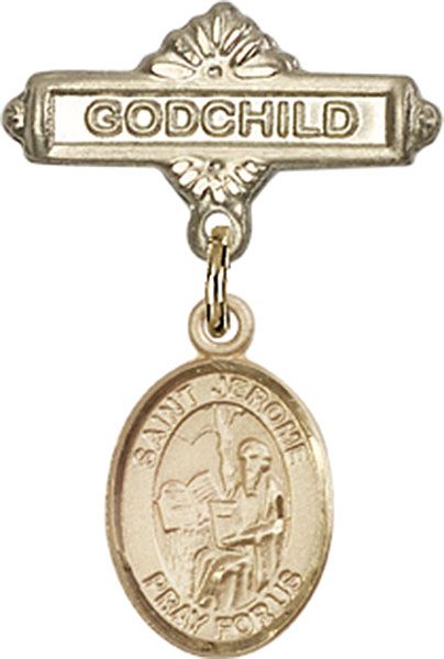 14kt Gold St. Jerome charm measures 1/2 x 1/4 inches 14kt Gold Godchild Badge Pin measures 3/4 x 3/8 inches Presented in a deluxe gift box