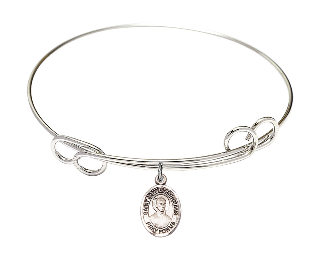 7.5-inch Round Double Loop Rhodium Bangle Bracelet | Sterling Silver St. John Berchmans Charm | Engravable