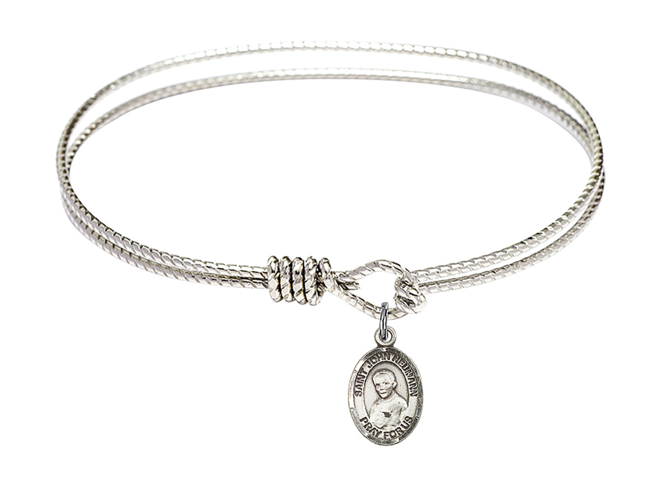 Our 7 1/4 inch Oval Eye Hook Rhodium Bangle Bracelet with a Sterling Silver St. John Neumann charm. is proudly manufactured in the USA.