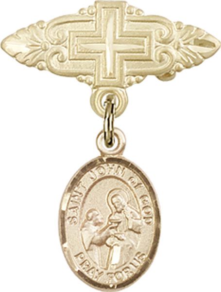 14kt Gold St. John of God charm measures 1/2 x 1/4 inches 14kt Gold Badge Pin With Cross measures 3/8 x 3/4 inches Presented in a deluxe gift box