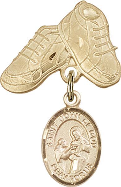 14kt Gold St. John of God charm measures 1/2 x 1/4 inches 14kt Gold Baby Boots Badge Pin measures 1/2 x 5/8 inches Presented in a deluxe gift box