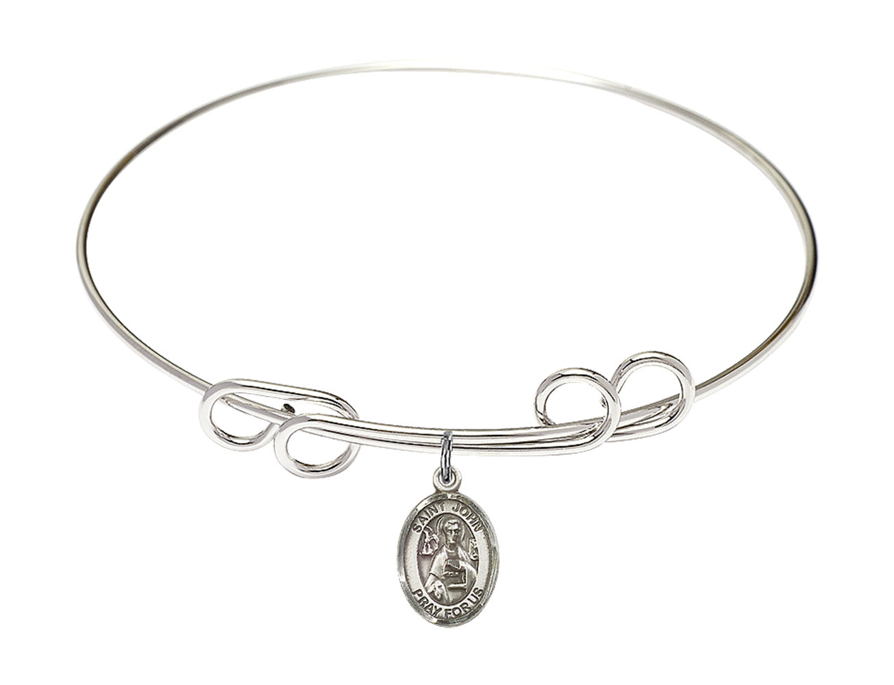 8-inch Round Double Loop Rhodium Bangle Bracelet | Sterling Silver St. John the Apostle Charm | Engravable
