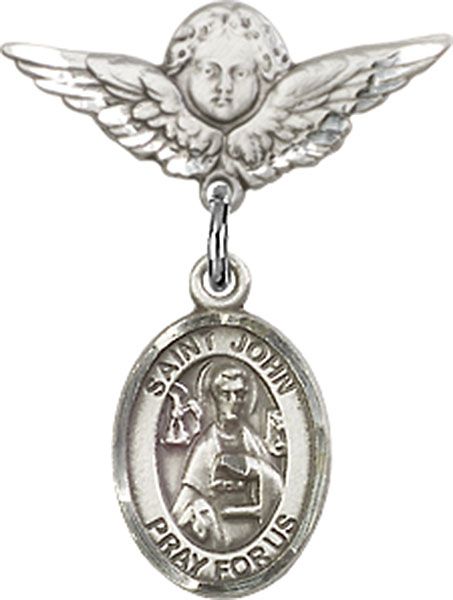 Sterling Silver Baby Badge with St. John the Apostle Charm and Small Angel w/Wings Badge Pin
