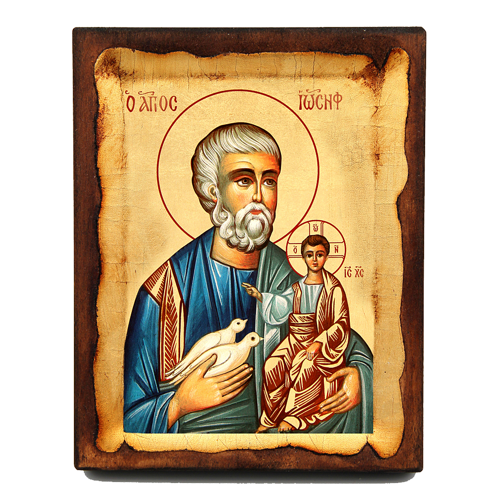 Hand Painted St Joseph Icon containing Gold Leaf - Dark Brown Scroll Frame. Hand made/painted in Greece.