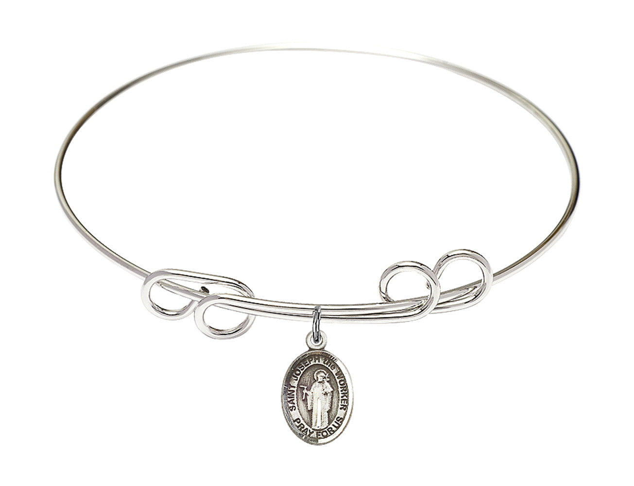 8-inch Round Double Loop Rhodium Bangle Bracelet | Sterling Silver St. Joseph the Worker Charm | Engravable