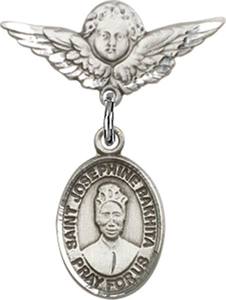 Sterling Silver Baby Badge with St. Josephine Bakhita Charm and Small Angel w/Wings Badge Pin