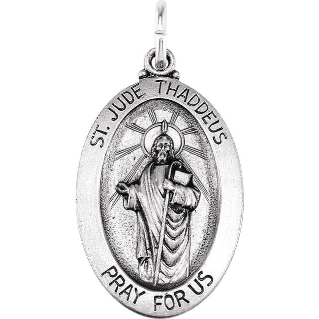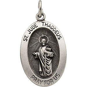 This 14 Karat White Gold St. Jude Thaddeus Medal measures 15 x 11 mm, roughly equivalent to 5/8-inch by 3/8-inch.