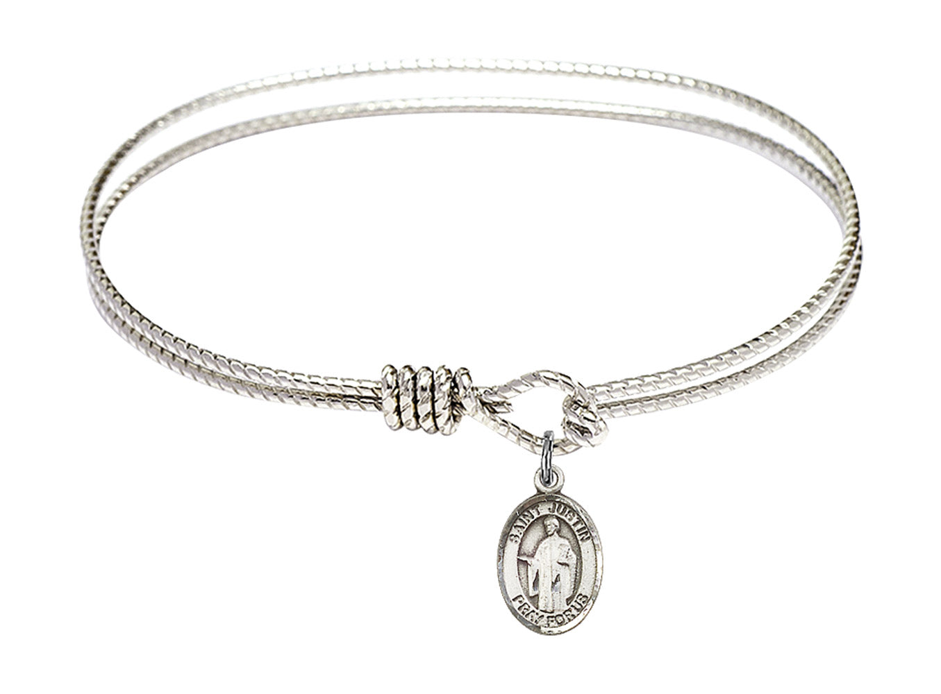Our 7 1/4 inch Oval Eye Hook Rhodium Bangle Bracelet with a Sterling Silver St. Justin charm. is proudly manufactured in the USA.