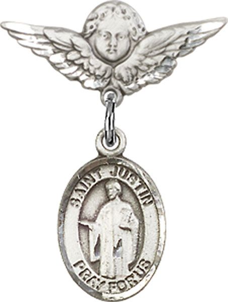 Sterling Silver Baby Badge with St. Justin Charm and Small Angel w/Wings Badge Pin