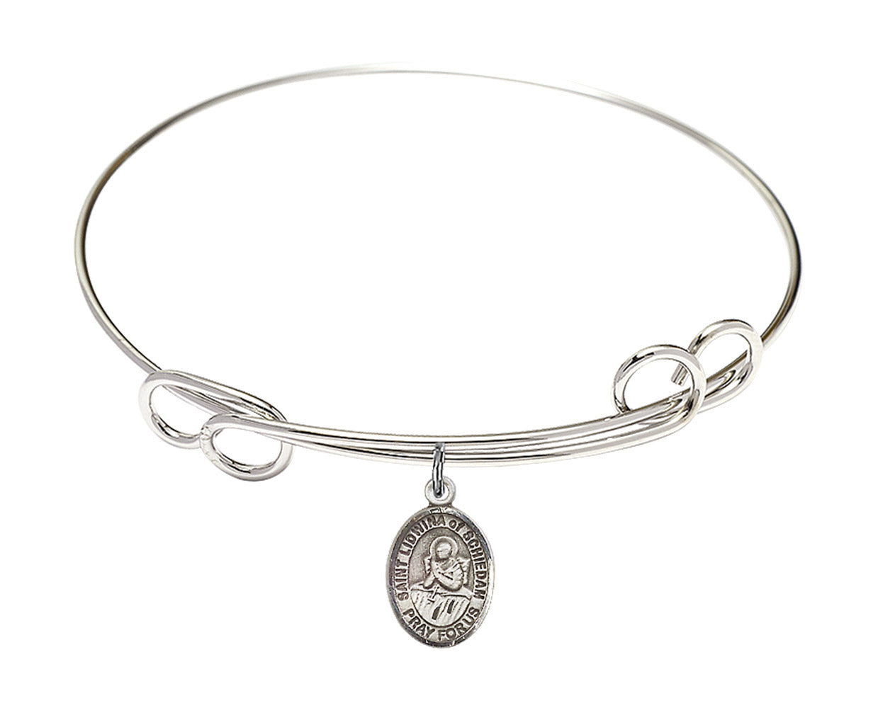 7.5-inch Round Double Loop Rhodium Bangle Bracelet | Sterling Silver St. Lidwina of Schiedam Charm | Engravable