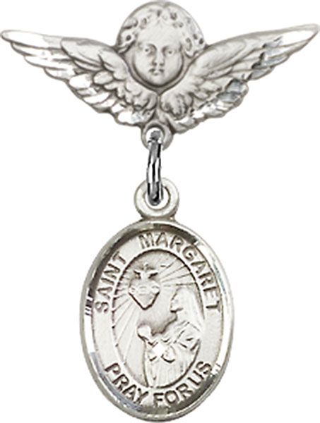 Sterling Silver Baby Badge with St. Margaret Mary Alacoque Charm and Small Angel w/Wings Badge Pin
