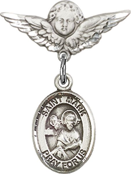 Sterling Silver Baby Badge with St. Mark the Evangelist Charm and Small Angel w/Wings Badge Pin