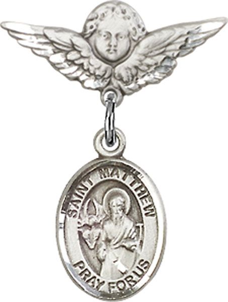 Sterling Silver Baby Badge with St. Matthew the Apostle Charm and Small Angel w/Wings Badge Pin
