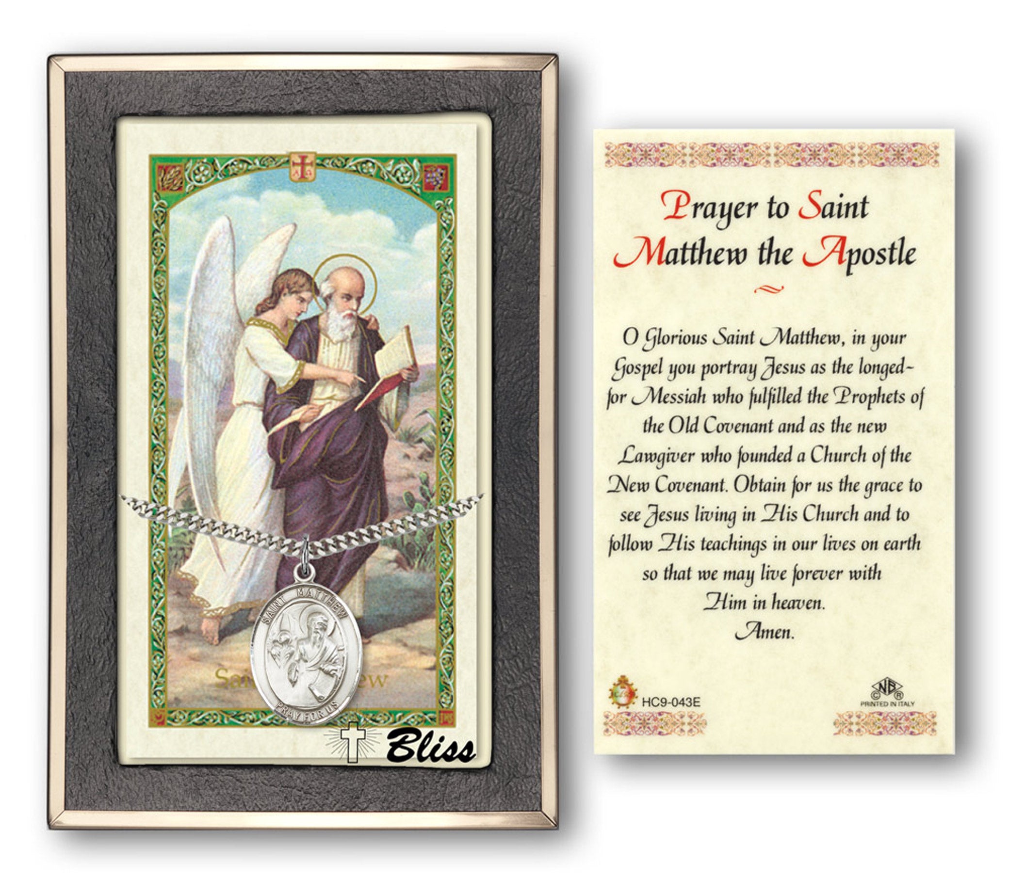 The large-sized Saint Matthew the Apostle Medal with Prayer Card will arrive in a deluxe jewelry box, ready to wear or give as a gift.
