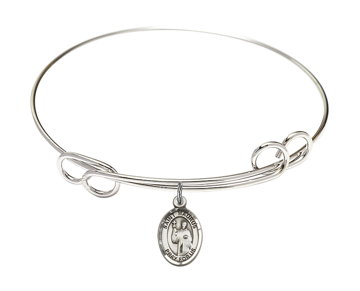 7.5-inch Round Double Loop Rhodium Bangle Bracelet | Sterling Silver St. Maurus Charm | Engravable