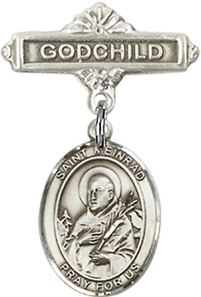 Sterling Silver Baby Badge with St. Meinrad of Einsiedeln Charm and Godchild Badge Pin