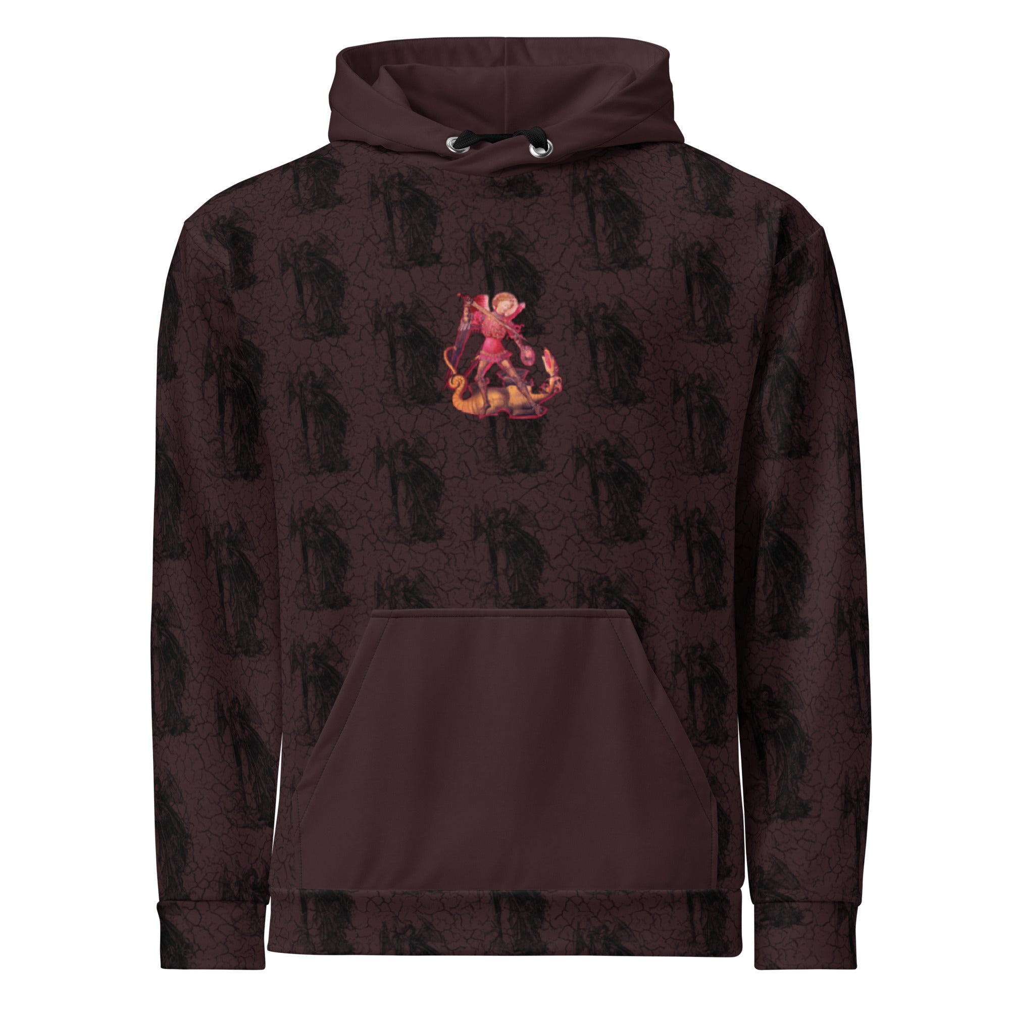 Featuring an ancient color image of St. Michael the Archangel layered over a textured background pattern made with an old-world etching, this St. Michael Hoodie is a subtly powerful statement of faith. The relaxed unisex design combines classic comfort with meaningful Catholic imagery, making it perfect for everyday wear or layering during cooler weather.