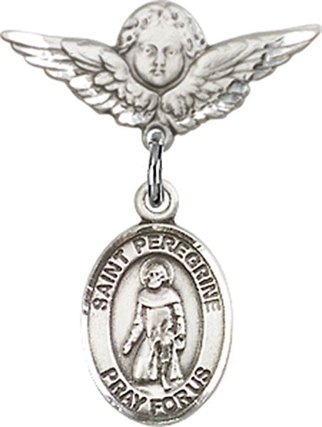 Sterling Silver Baby Badge with St. Peregrine Laziosi Charm and Small Angel w/Wings Badge Pin