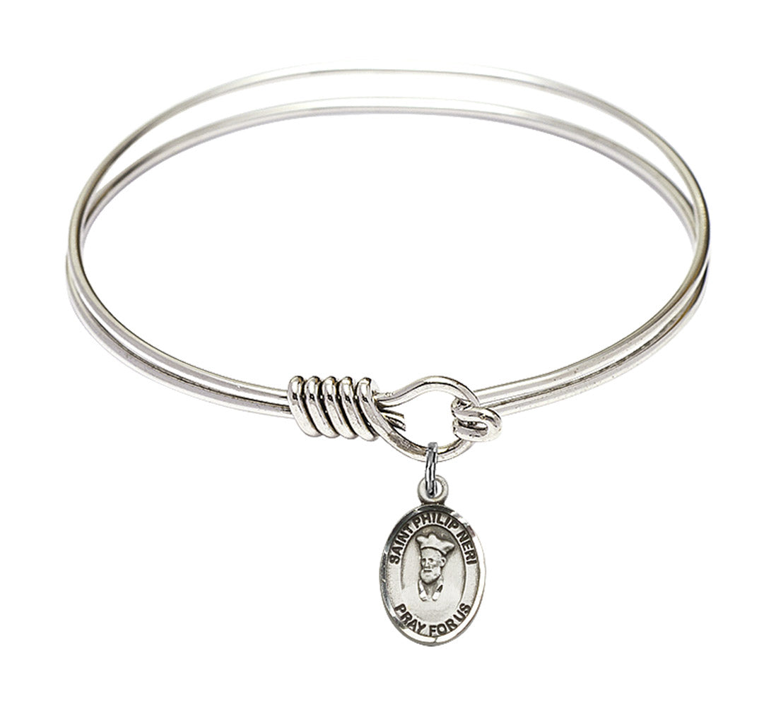 6 1/4 inch Round Eye Hook Rhodium Bangle Bracelet with Sterling Silver St. Philip Neri Charm