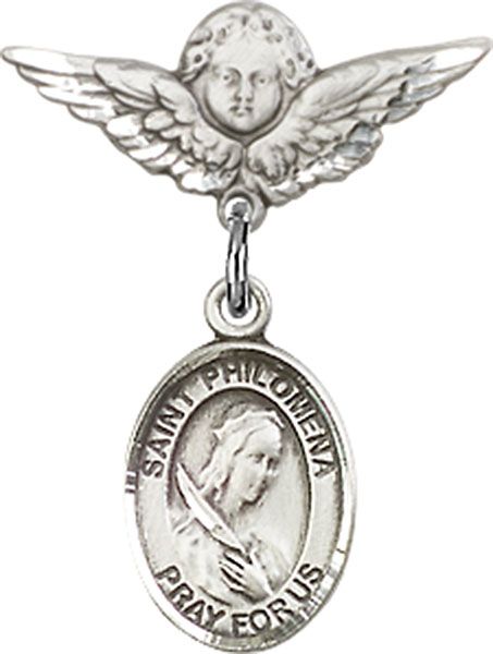 Sterling Silver Baby Badge with St. Philomena Charm and Small Angel w/Wings Badge Pin