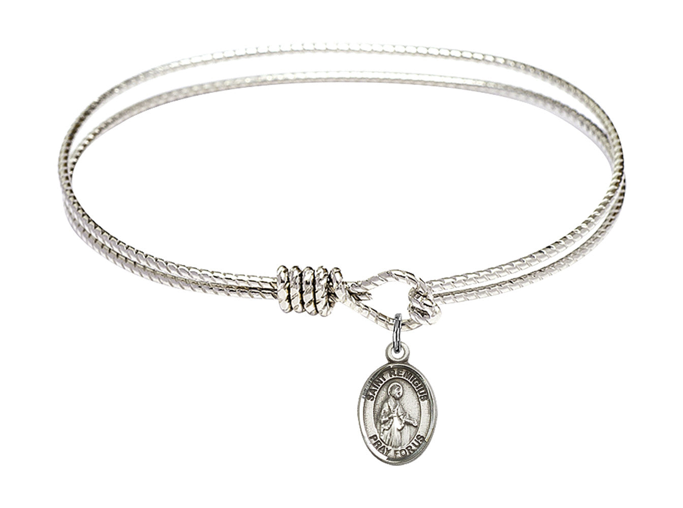 Our 7 1/4 inch Oval Eye Hook Rhodium Bangle Bracelet with a Sterling Silver St. Remigius of Reims charm. is proudly manufactured in the USA.
