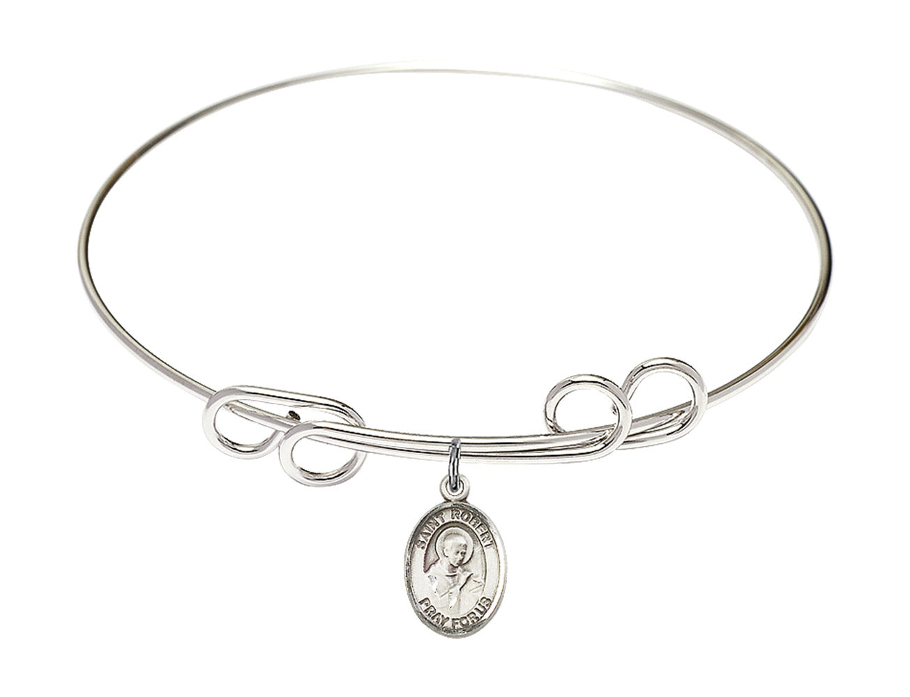 8-inch Round Double Loop Rhodium Bangle Bracelet | Sterling Silver St. Robert Bellarmine Charm | Engravable