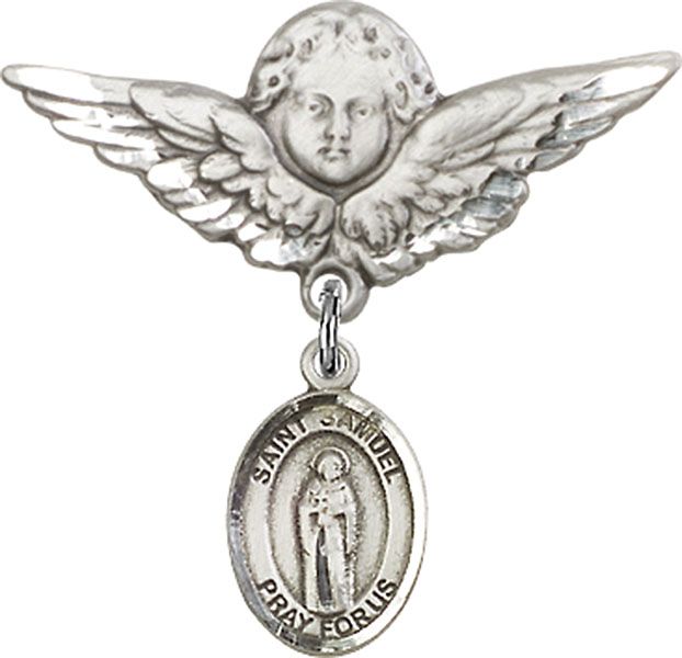 Sterling Silver Baby Badge with St. Samuel Charm and Large Angel w/Wings Badge Pin